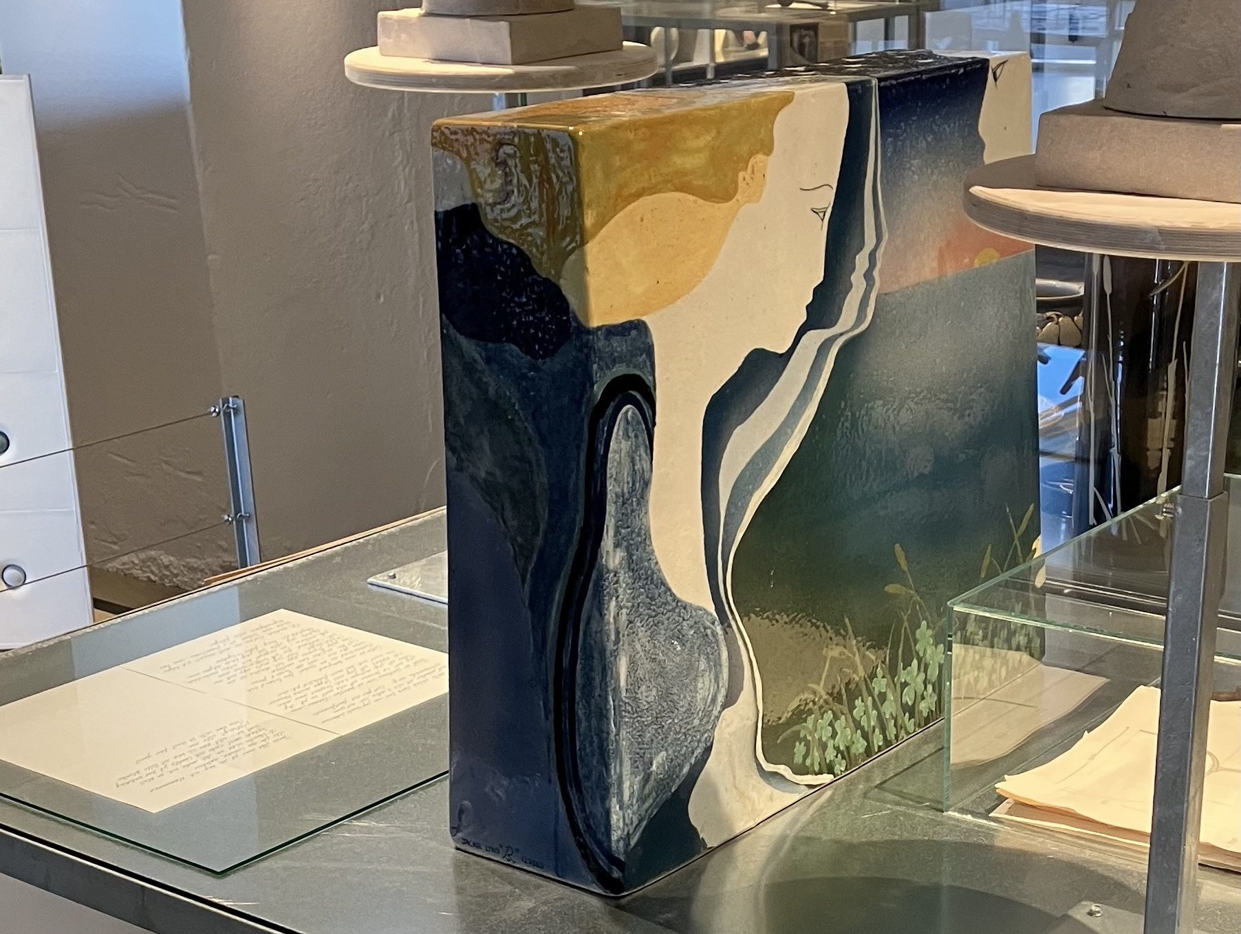 Porträtt på en kvinna med glasögon som står bland flera verk på Rörstrand museum.